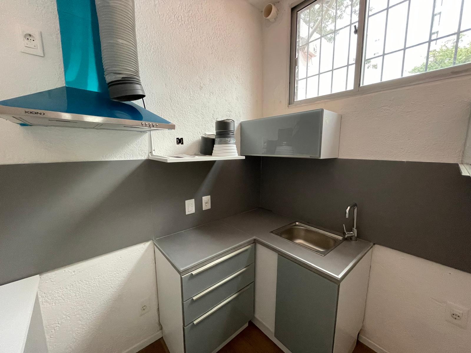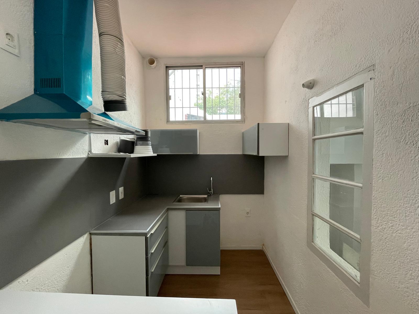 -Cocina semi-definida con muebles sobre y bajo mesada y campana extractora;